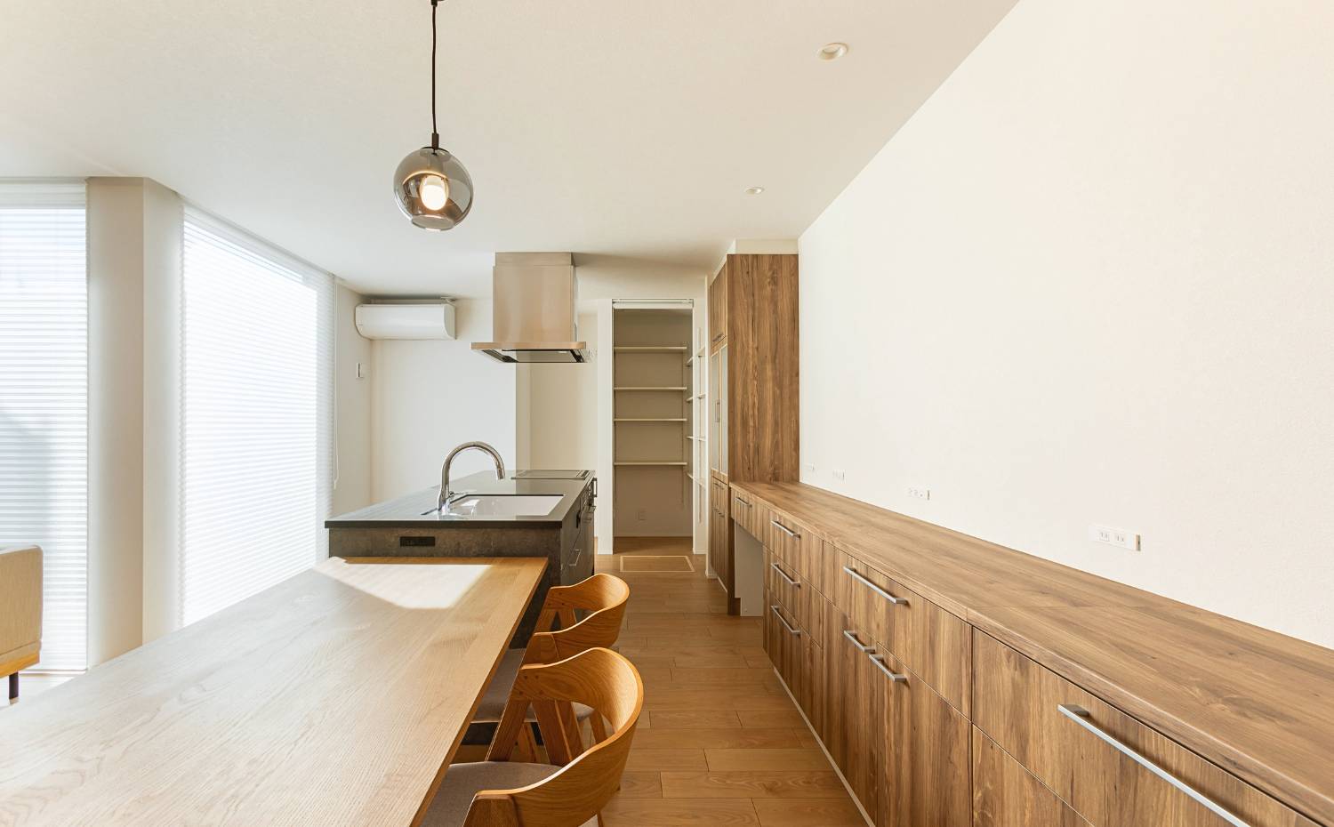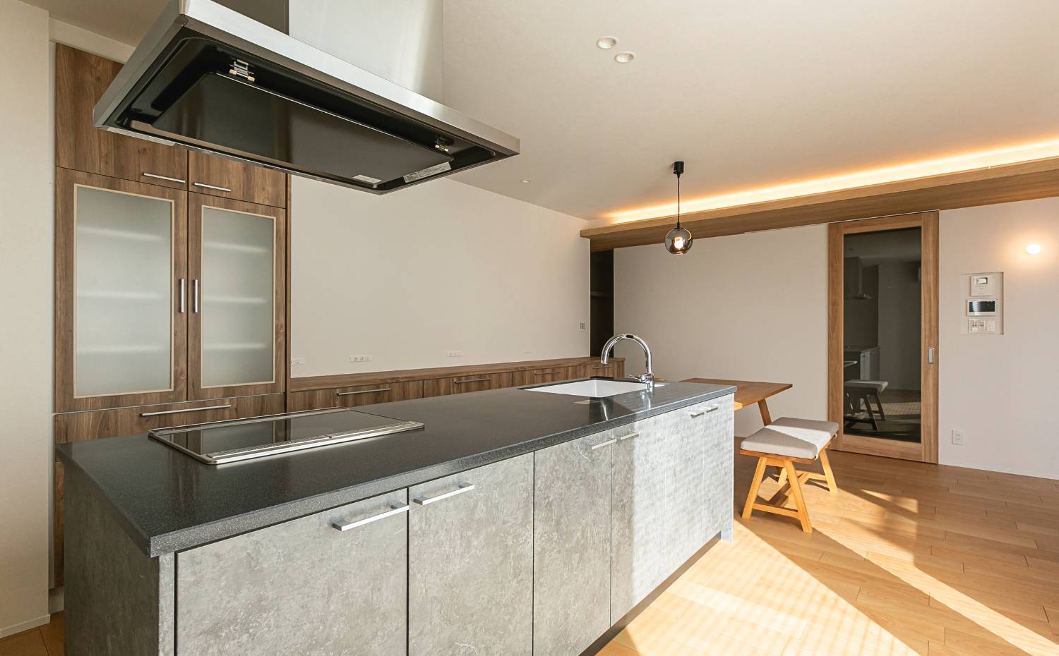 アイランドキッチンと横並びのダイニングは、家族の会話が自然と生まれる動線。収納を計画的に配置し、生活感を抑えたすっきりした空間を実現。