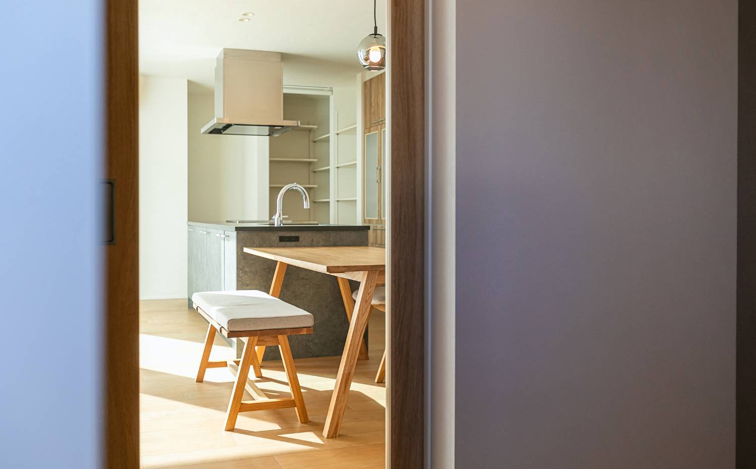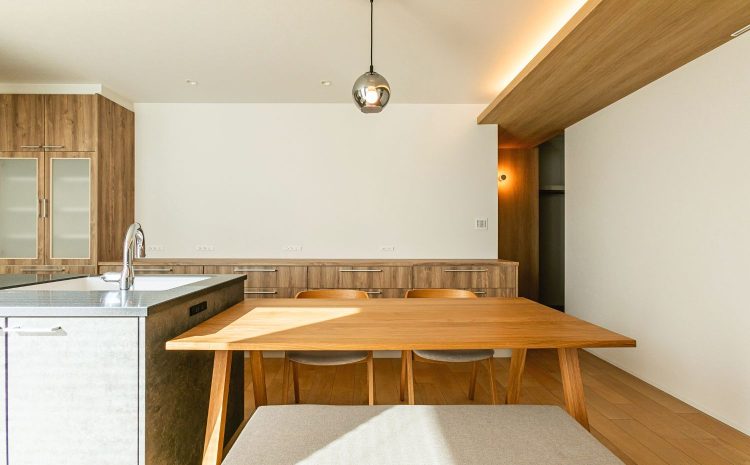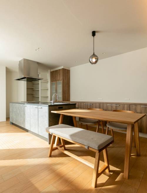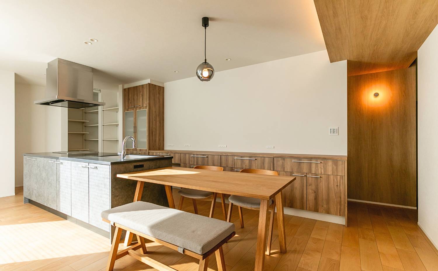 木目を基調とした温もりあるダイニングと、スマートなアイランドキッチンを一体に。