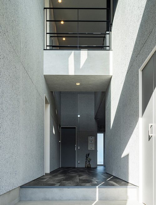 グレーの外壁に木目の玄関ドアがアクセントになっています。