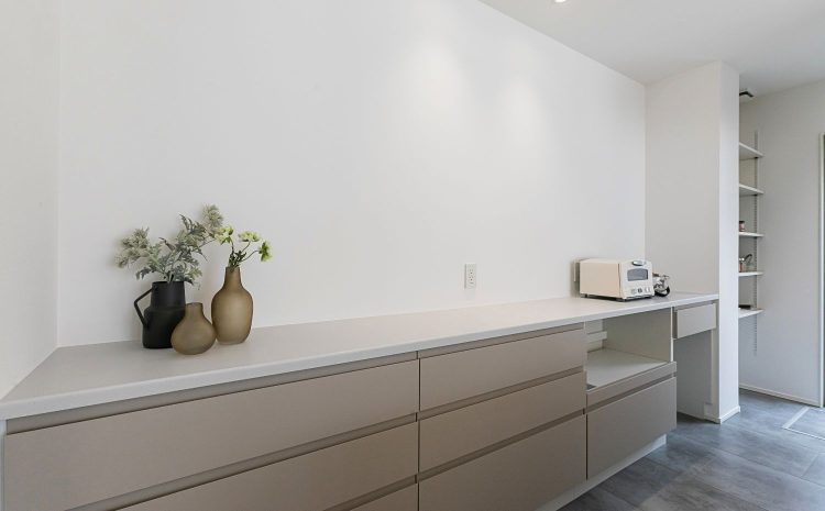 生活感を抑えたグレージュのフラットキッチンが、空間に溶け込みつつ上質な印象を演出します。