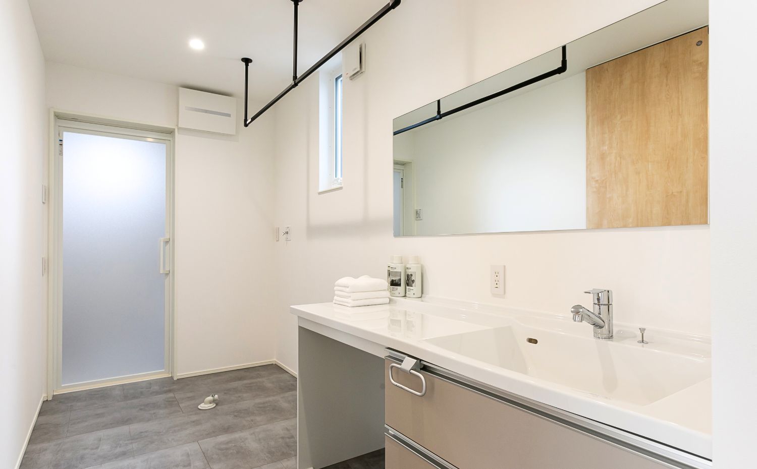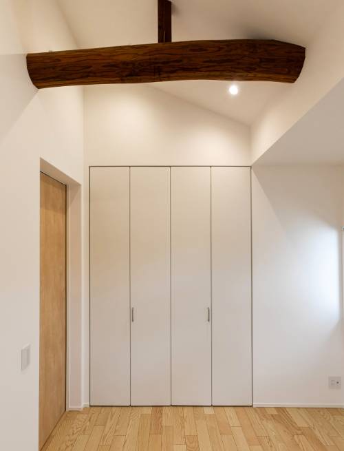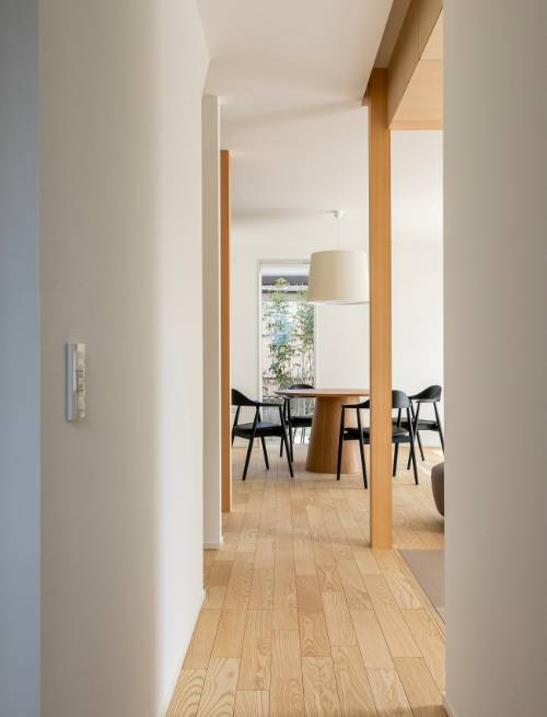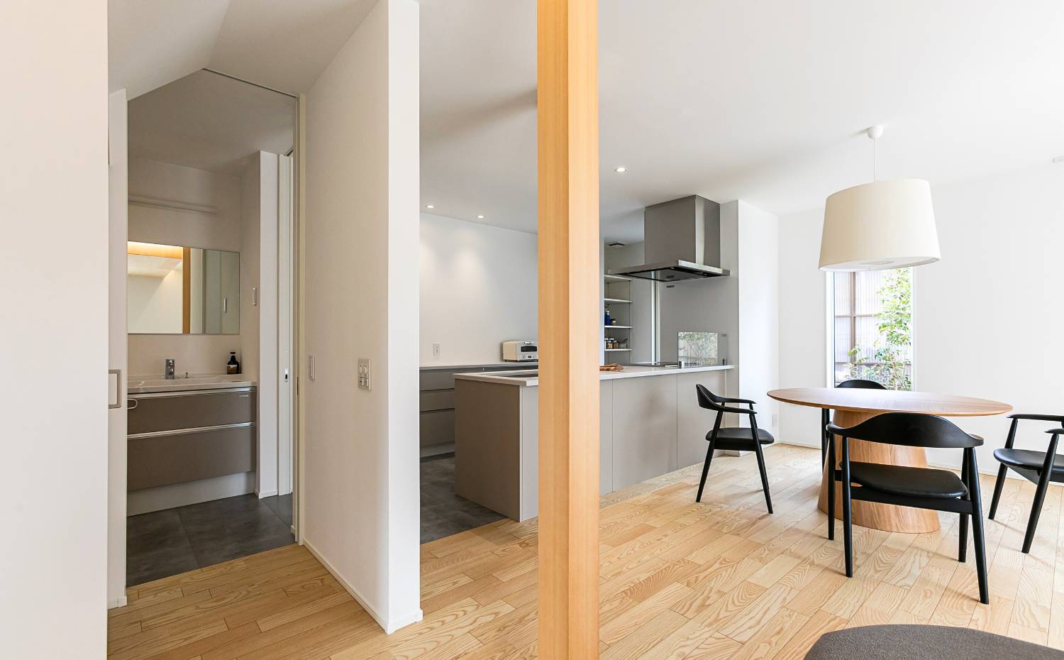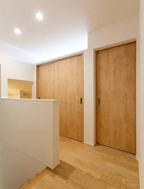 木の温もりと白壁のコントラストが美しく、帰宅時にほっとする落ち着いた雰囲気に仕上がっています。