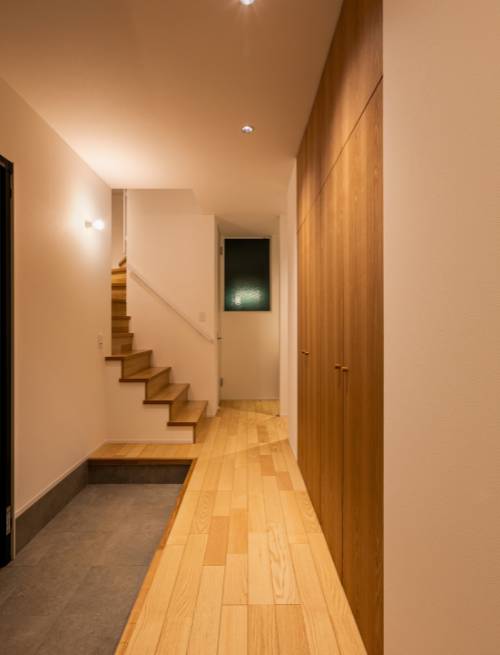 帰宅後すぐに手洗いへアクセスできる、シンプルで機能的な玄関ホールです。